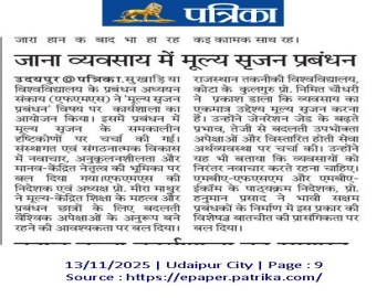 The Faculty of Management Studies (FMS), Mohanlal Sukhadia University, organized an expert talk on “Managing Value Creation,” delivered by Prof. Nimit Chowdhary, Hon’ble Vice Chancellor, Rajasthan Technical University, Kota on 11.11.2025
